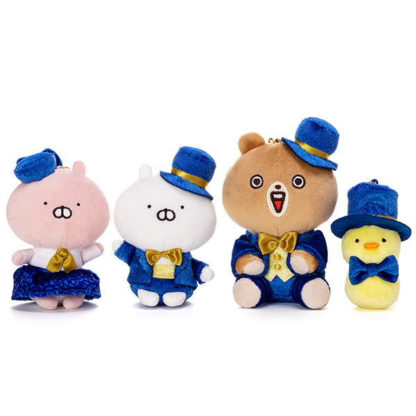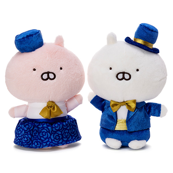 ドレスアップしたうさまる&うさこのペアぬいぐるみ(BOX入り)。全商品にうさまる展ステッカー付き。